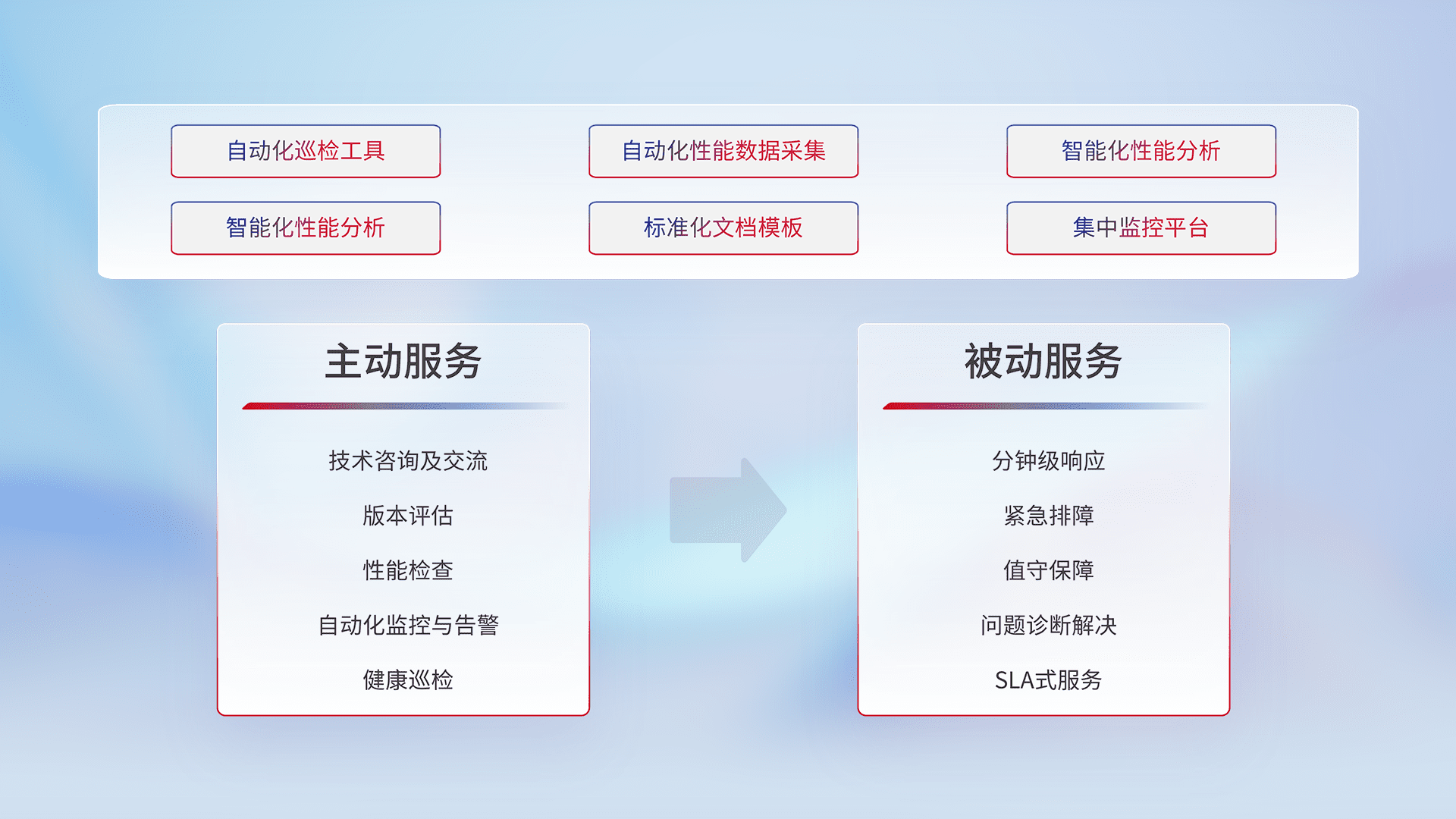 智能化工具和标准化文档,,保障服务质量,,提供主动服务(包含技术咨询、、、版本评估、、、、性能检查、、、、自动化监控与告警、、健康巡检)和被动服务包含(分钟级响应、、、紧急排障、、值守保障、、、、问题诊断解决、、SLA服务)。。